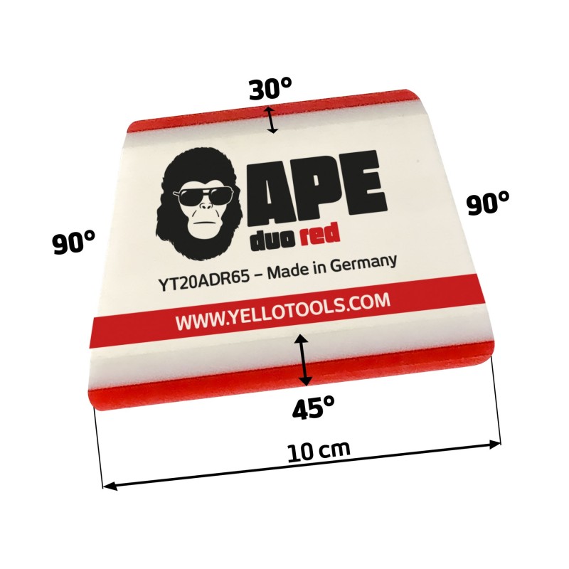 Le confort d'utilisation de ce racloir provient principalement de sa forme ergonomique. Le Yellotools Ape Duo Red possède une construction à deux couches, ce qui améliore la flexibilité du racloir. Les bords soigneusement conçus avec des angles de 30, 45 et 90 degrés rendent l'application beaucoup plus facile, rapide et agréable. Si tu as déjà eu l'occasion de travailler avec l'APE Duo Green, sache que le Yellotools Ape Duo Red est une version plus flexible de ce produit.